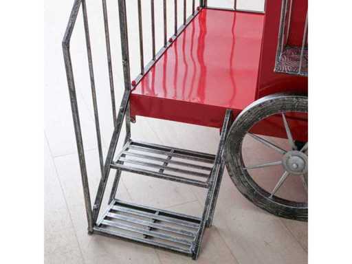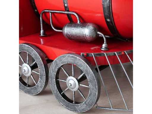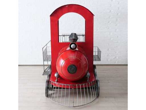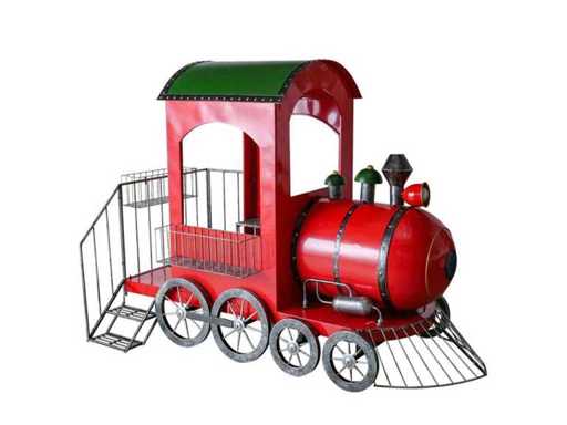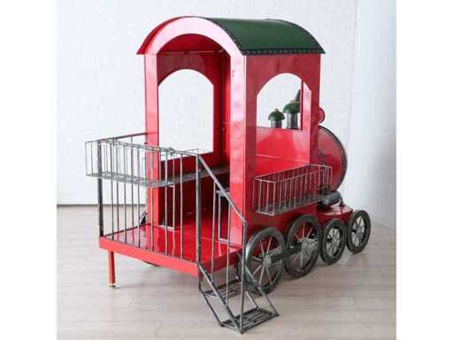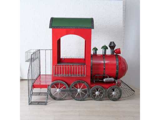 Decoratieve ijzeren trein, rood en groen geschilderd. Ontworpen voor binnen- of buitengebruik, ideaal voor feestelijke decoraties of etalages.