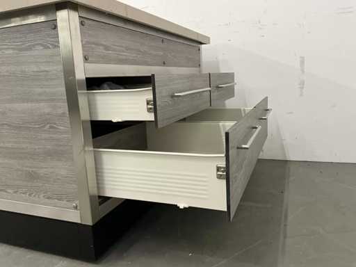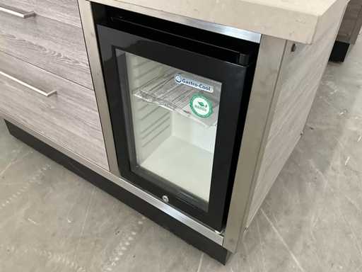 V.v. Silestone werkblad. V.v. Gastro-Cool (GCKW25) koelkast, diverse lades, stopcontacten en regelkast.
