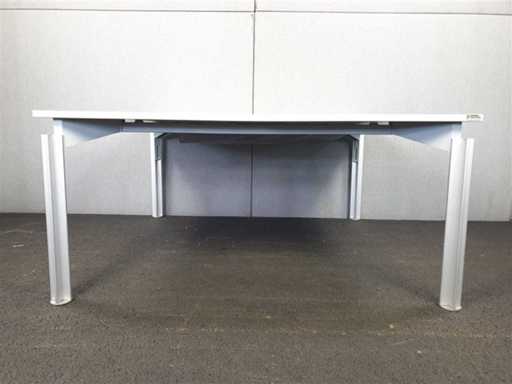 BULO H2O 2 persoons werkbench, kleur blad esdoorn, materiaal melamine, kleur poten alu, materiaal vol aluminium, afm. L160 X B160 , beperkt manueel in hoogte verstelbaar, kabeldoorvoer aanwezig, geen elektrificatie, zeer lichte gebruikssporen