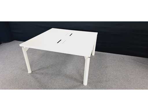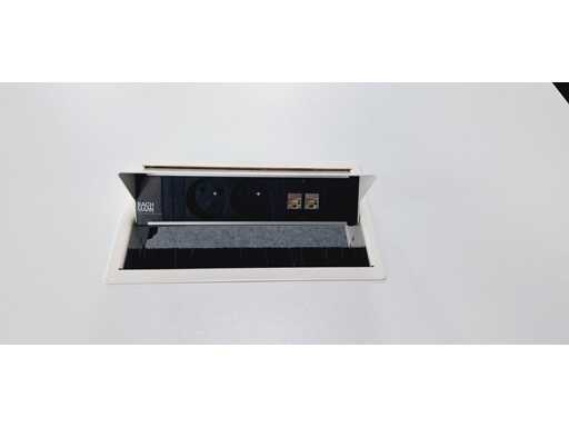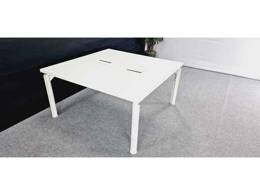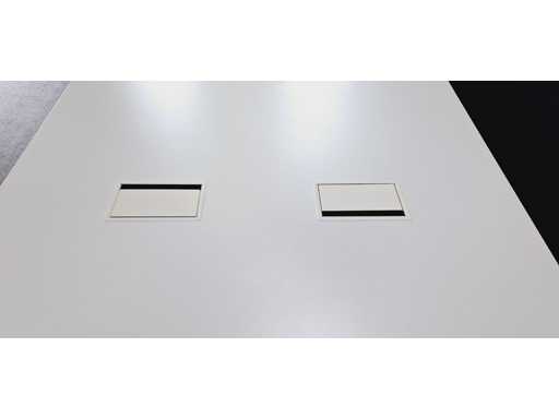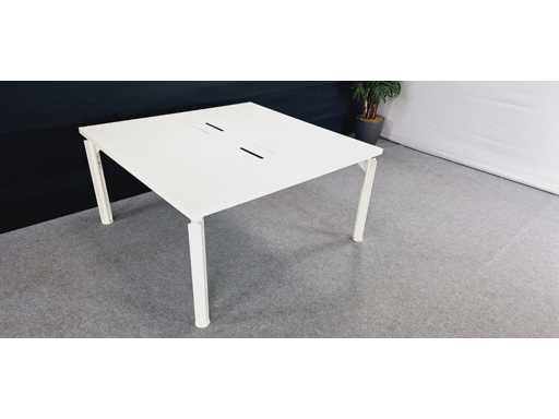 in hoogte verstelbaar onderstel in aluminium kleur Wit, blad in melamine kleur wit voorzien van 2 x powerboxelektrificatie (2x power + UTP), afm. 1450 x 1450 mm, gebruikssporen aanwezig