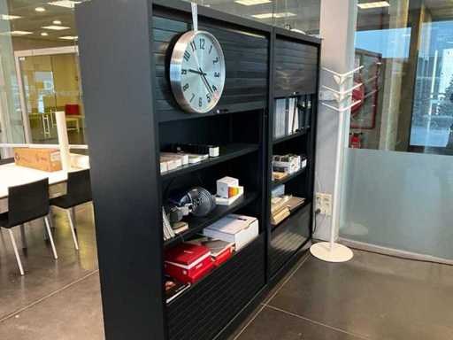 Bestaand uit 1x bureau, 1x bureaustoel, 2x rolgordijn Bureelkast zwart afmetingen 45x120x200 cm met inhoud, +2x scherm Fujitsu, +2x telefoon Belgacom, + witte staande kledinghanger