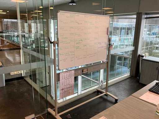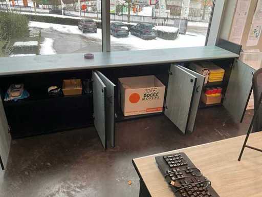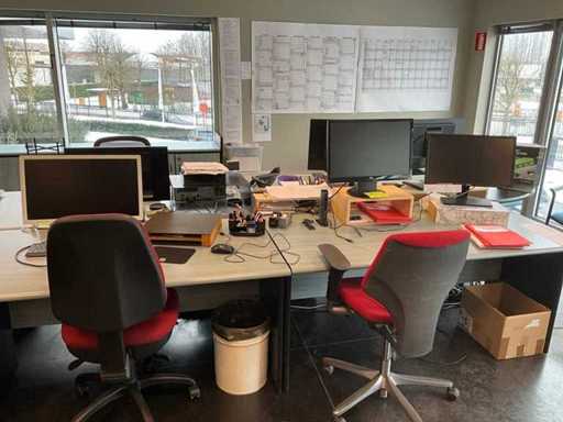 Bestaand uit 1x L-vormig bureau afmetingen 205x247x72 cm, +3x bureautafel breedte 160-180 met 4x bureaustoel + 1x bureautafel 80x120 mm, 1x gewone stoel,+2x ladekast, 2x scherm Fujitsu +1x Benq +3x Samsung met klavier en muis, + 6 deurs voorraadkast afmetingen 48x270x75 cm, +Whiteboard mobiel, kleine bureauaccesoires en kapstok enz..