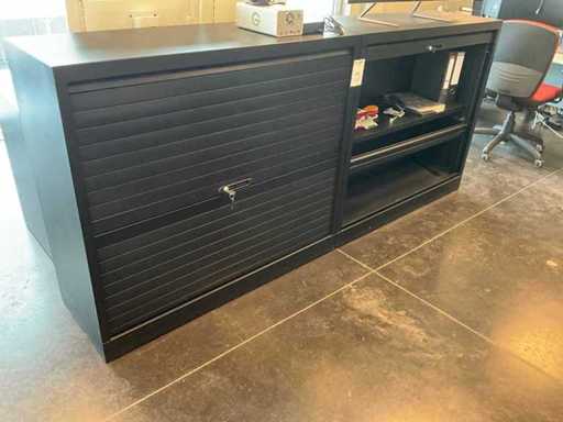 Bestaand uit 1x L-vormig bureau afmetingen 266x210x72 cm,+ ladekast, 2x scherm Fujitsu met klavier en muis, + 2x roldeurkast afmetingen 45x120x105 cm met inhoud enz..
