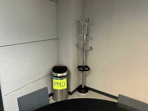 Bestaand uit 1x bureau 250x130x76 cm, 3x bureaustoel, 1x bureaukast 4-deurs breedte 180 cm met inhoud, 1x ronde vergadertafel diameter 170 cm met 4 stoelen, 1x kapstok +1x afvalemmer