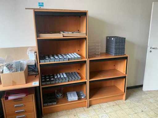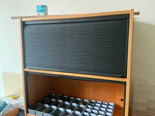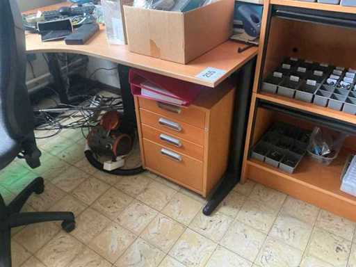 Zonder inhoud. Met bureaustoel en 2x Ladenblok Zonder computer en scherm. Inclusief 2x kast met dubbele rolluik afmetingen 84x42x100 cm. 1x kast met 4 rolluiken 84x42x180 cm.