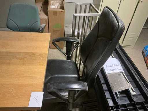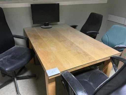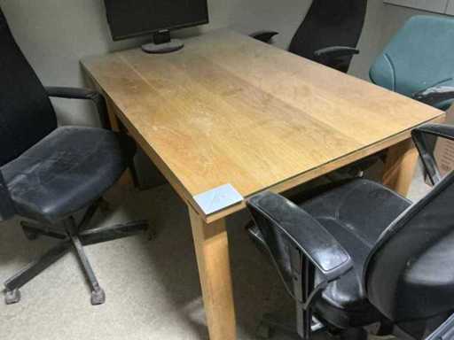 Bestaande uit houten bureautafel voorzien van glazen afdekblad, met afmetingen ca. 140 x 85 x 76cm en 4x bureaustoel.