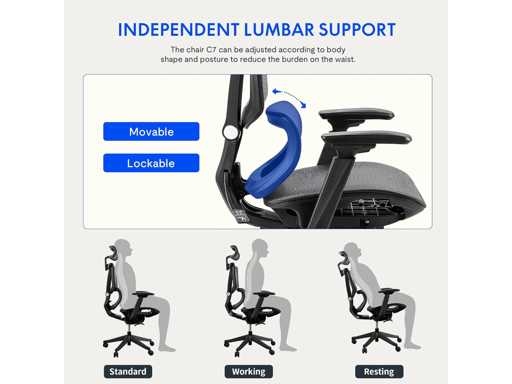VERSTELBARE ERGONOMIE: Deze ergonomische stoel is uitgerust met een verstelbare lendensteun die perfect aansluit bij de natuurlijke kromming van de wervelkolom. De FlexiSpot C7-Air-Pro wordt geleverd met voetsteunen voor optimaal comfort en ondersteuning bij langdurig werken.