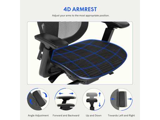 4D-ARMLEUNINGEN VOOR OPTIMAAL COMFORT: Geavanceerde 4D-armleuningen zijn verstelbaar in hoogte, hoek, breedte en diepte om je armen perfect te ondersteunen en vermoeidheid te verminderen.