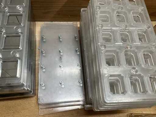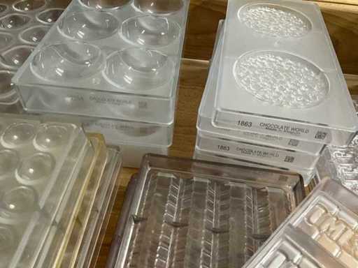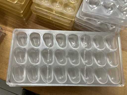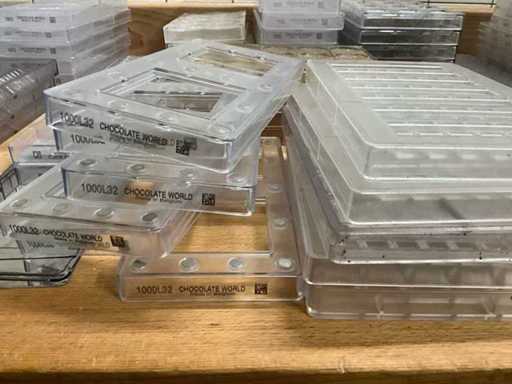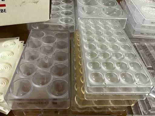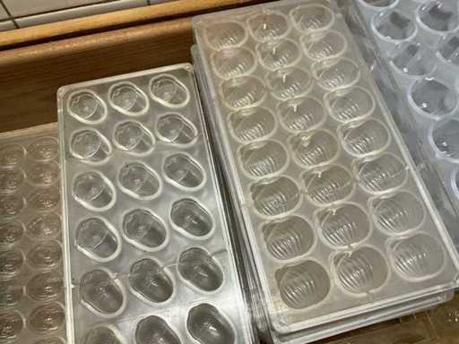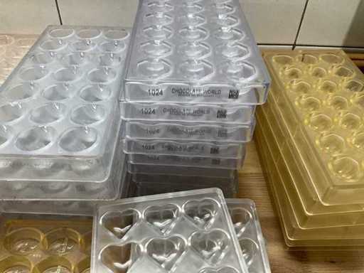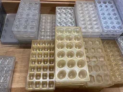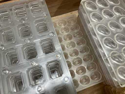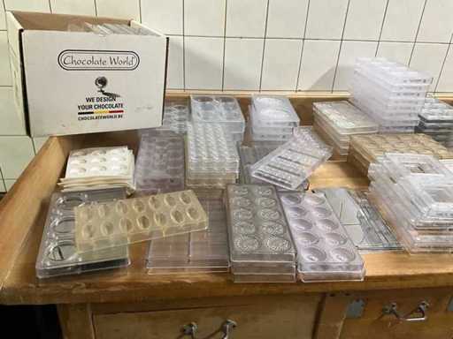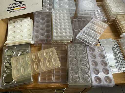 Grote partij professionele chocoladevormen voor het maken van pralines in diverse thema’s. Minimum 200 stuks. Diverse modellen aanwezig (zie nummers op foto)- inclusief 2 opbergbakken