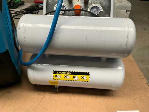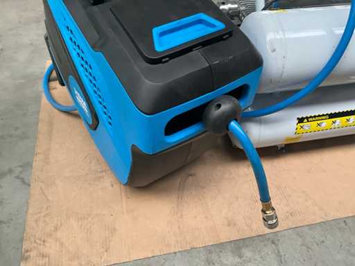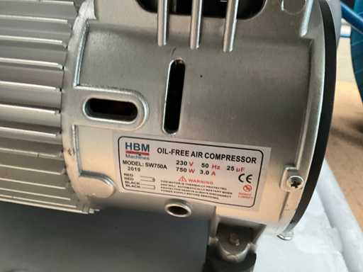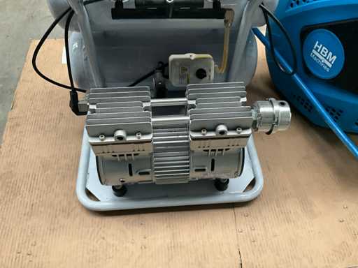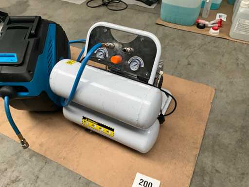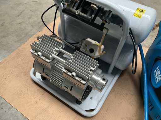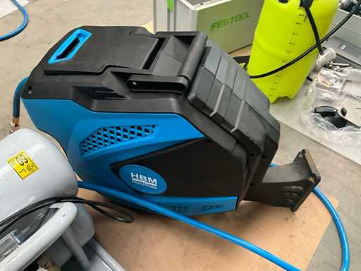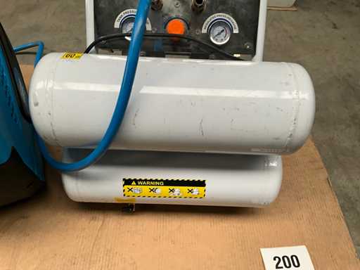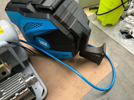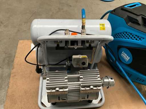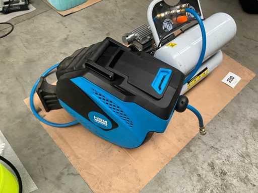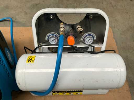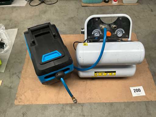 Oil-free air silence compressor model SW750A, compleet met persluchtdarm op haspel met terugslagklep, kan gemonteerd worden aan muur, draaibaar.