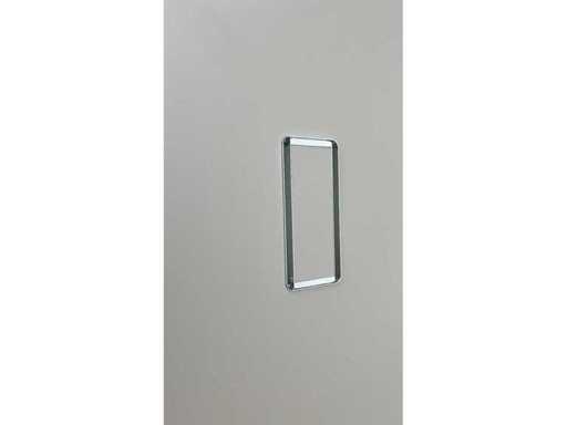 Vergadertafel met een muisgrijs HPL-blad en wit metalen poten. Voorzien van centrale kabeldoorvoer, geschikt voor vergaderruimtes of teamopstellingen.