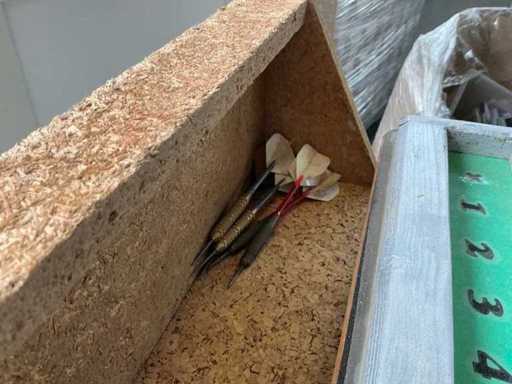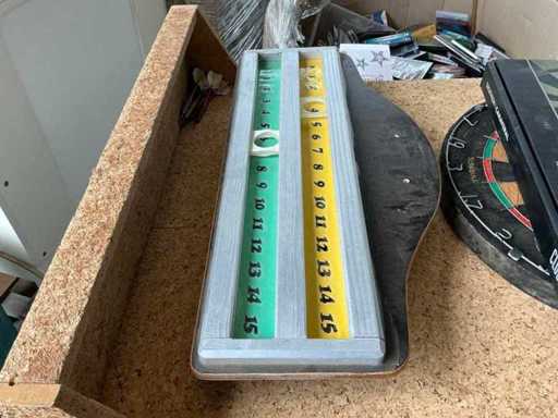Compleet met houten omkasting, diverse pijltjes en scorebord