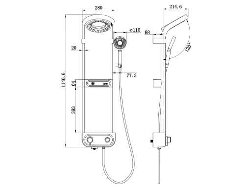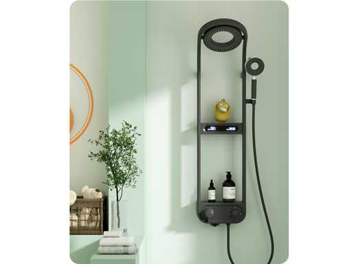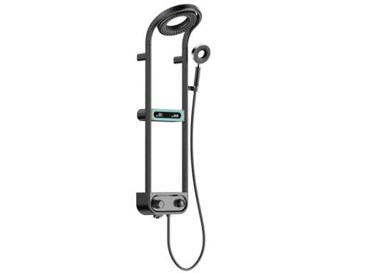 opbouw regendouche met digitaal display, Materiaal messing/RVS/ABS, Kleur mat zwart, Binnenwerk keramisch, Douchekop draaibaar, Handdouche verstelbaar met doucheslang (abs), Voorzien van digitale micromotor aansturing door middel van waterflow, geen stroom nodig, temperatuur digitaal afleesbaar, digitale aanduiding tijdsduur, keramisch binnenwerk goed voor 800.000 keer open/dicht zonder lekkage, plaatdikte: 12 UM, werkdruk: 2-12 kgf/cm2, werking temperatuur: 0 tot 90 graden Celsius, anti kalk behandeld, badkraan uitloop, Conditie: Nieuw in doos, Bijzonderheden 2 jaar garantie, h.o.h. afstand van 150 mm