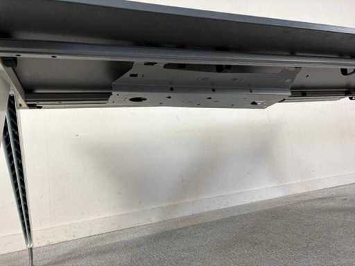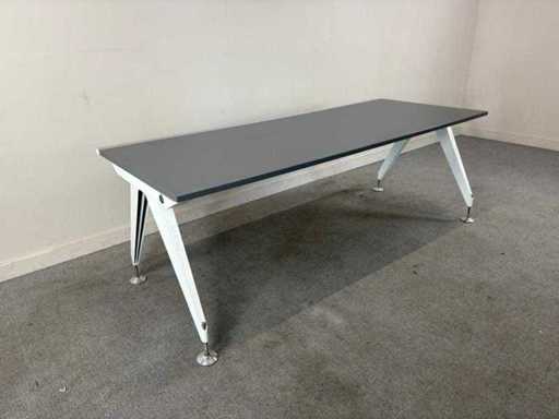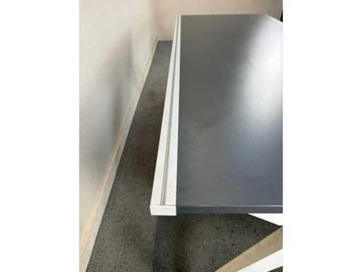 Bureautafel met grijze top op wit metalen onderstel. Met gebruikssporen, staat kan variëren per item.