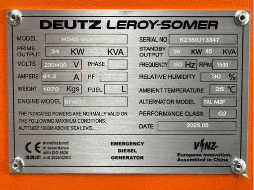 - vermogen: 45 kVA standby / 42,5 kVA prime (cos φ 0,8)
