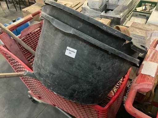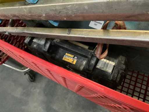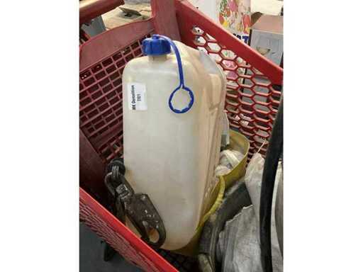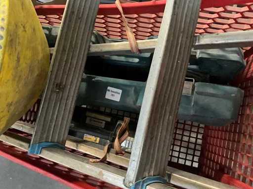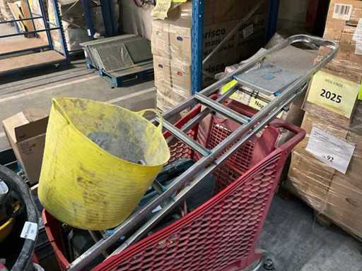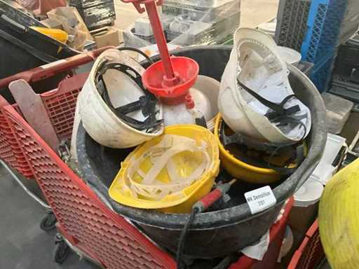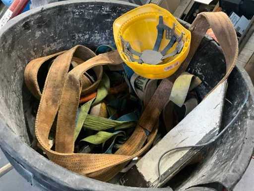 Waaronder 2x opbergbak Dewalt en Makita, ladder(stuk), diverse helmen, 3 diverse mortelkuipen, jerrycan, spuitpomp Mesto en diverse hijsbanden, waterpas