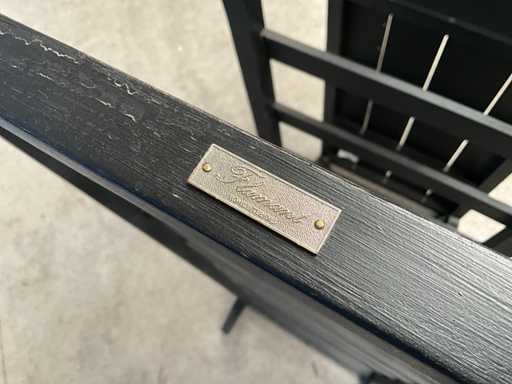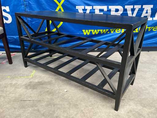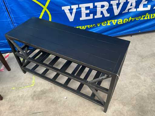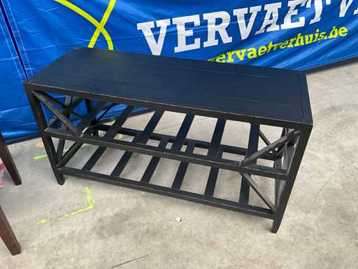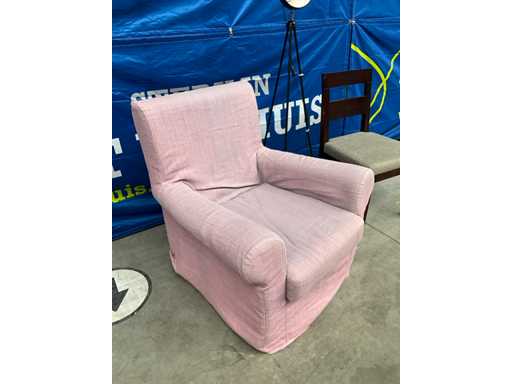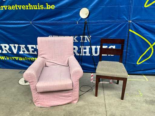 Waaronder stoffen zetel, vloerlamp, houten bijzetstoel met stoffen zitting, FLAMANT houten bijzettafel/kast 120x45x64cm.