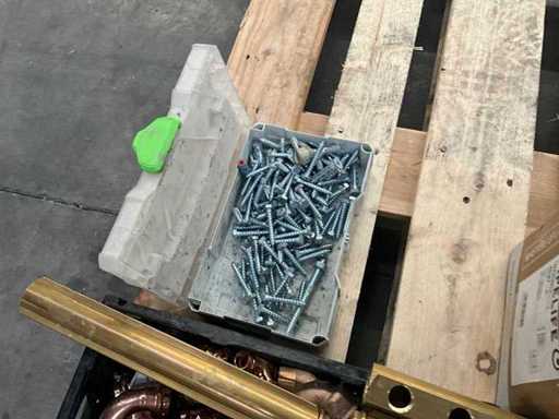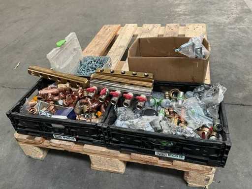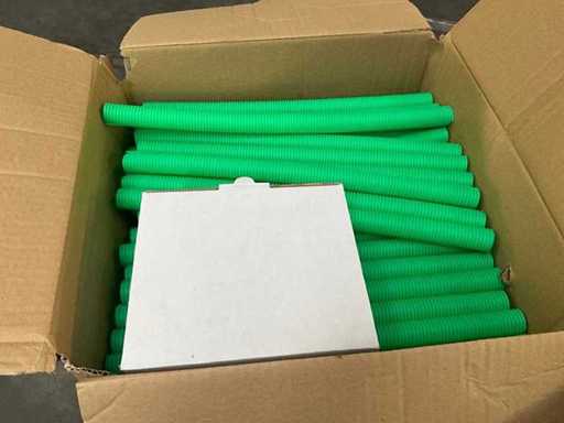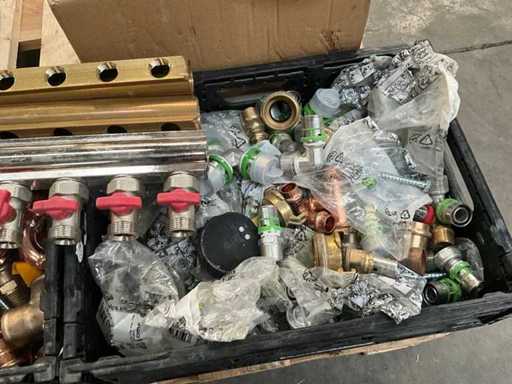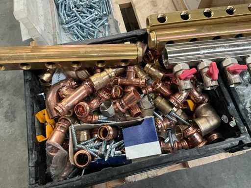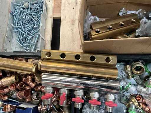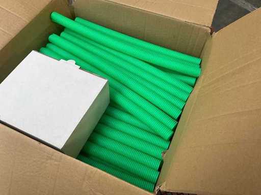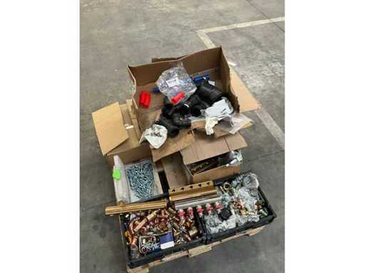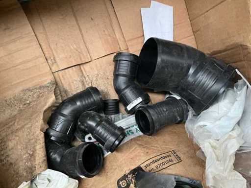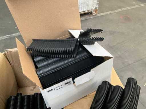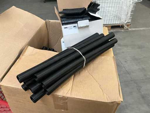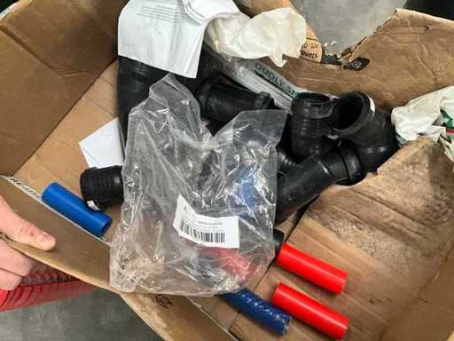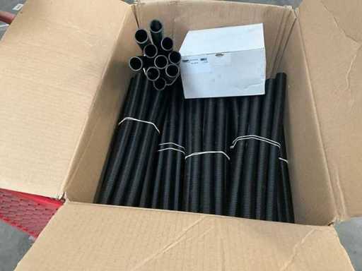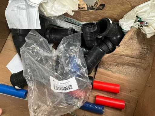 Waaronder diverse bochten, T stukken, diverse collectors, divers bevestigingsmateriaal, diverse clips Henco, diverse ringslangen voor kabelbescherming, aangesproken rol elektriciteitskabel EUPEN.