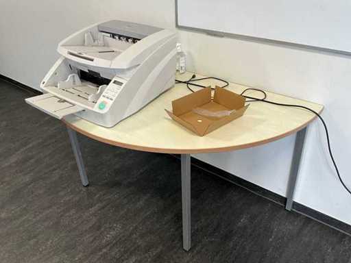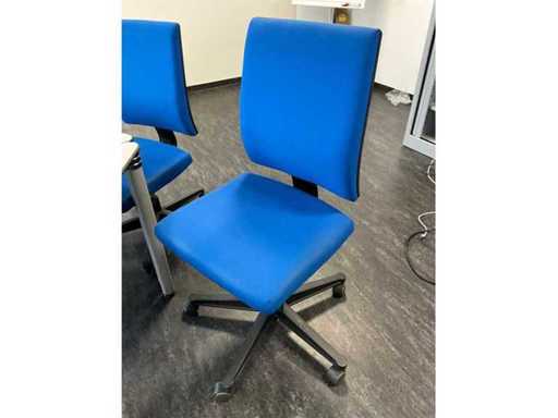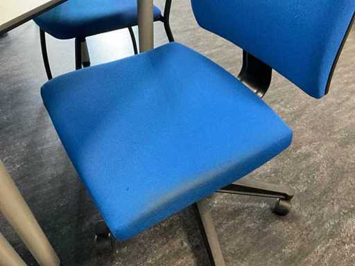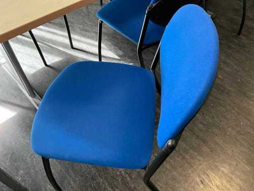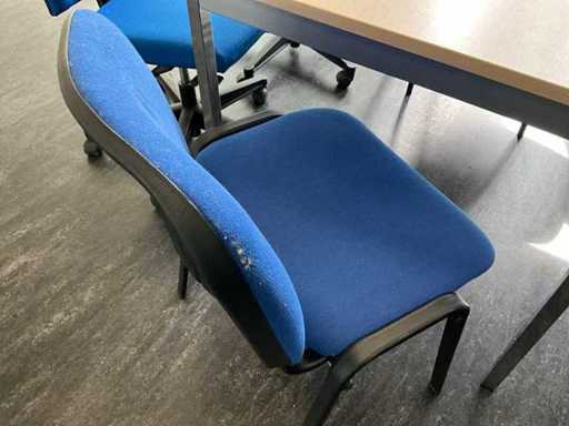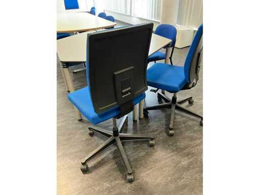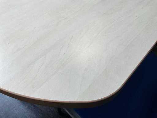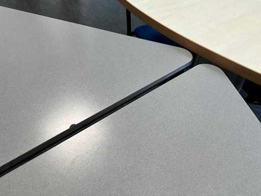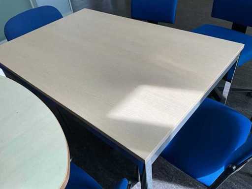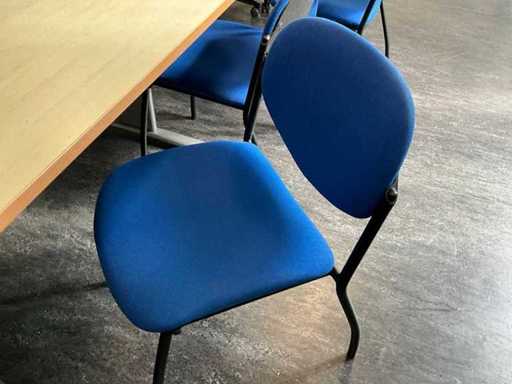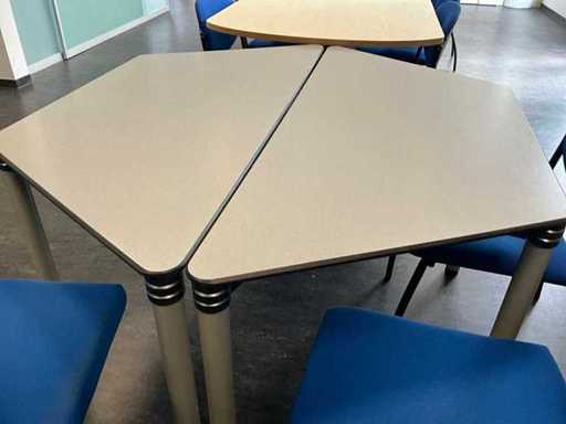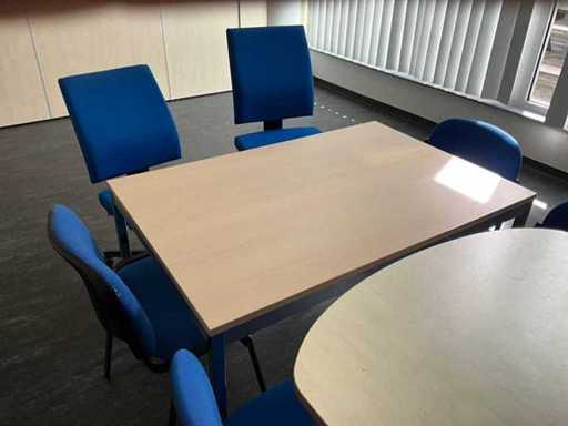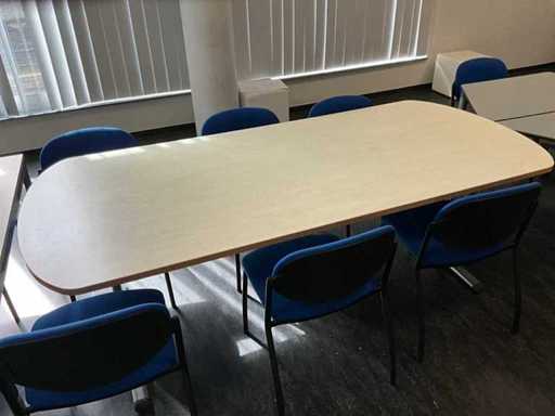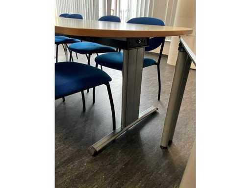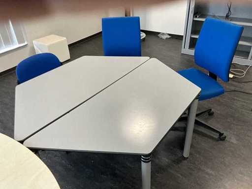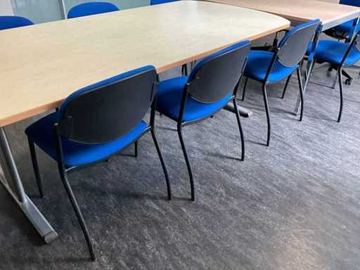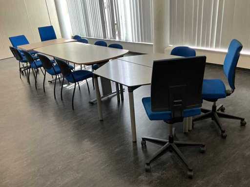 Bestaande uit vergadertafel 220x100cm, tafel 120x80cm, 2x trapezium tafel 140x61cm, 1x halfronde tafel 160x80cm + 4x Sedus bureaustoel, 9x vergaderstoel.