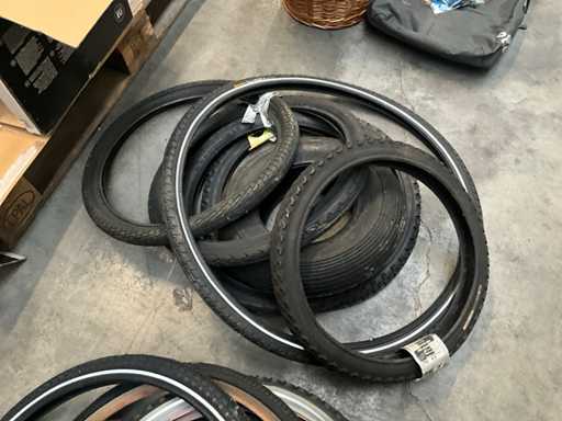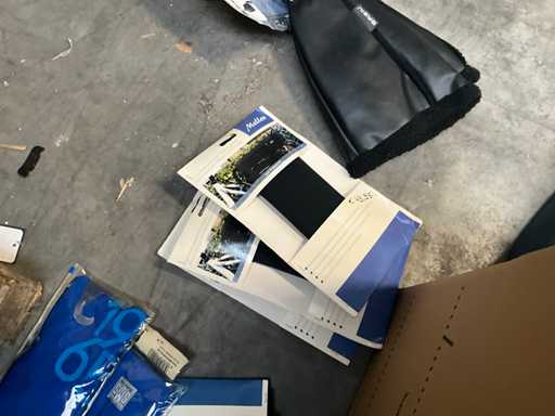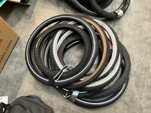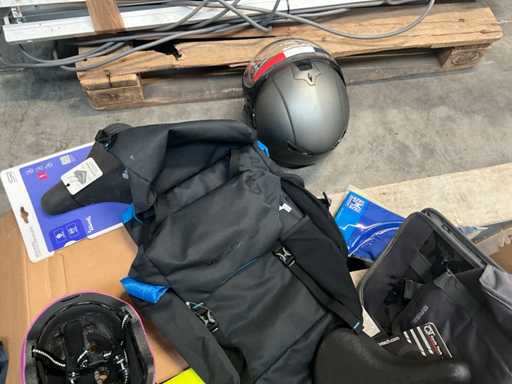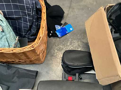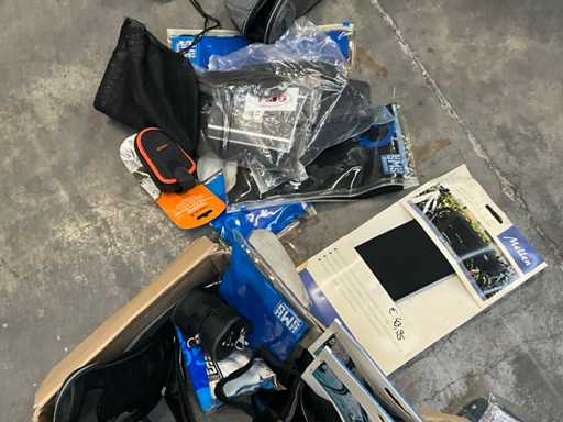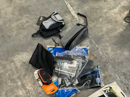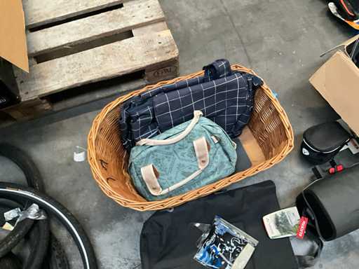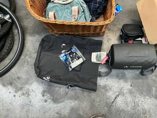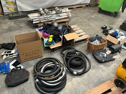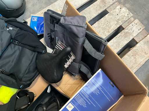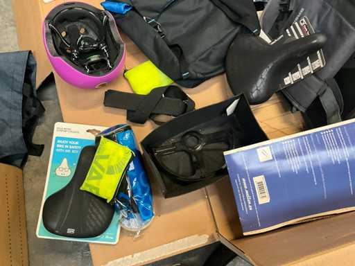 Waaronder diverse fietshelmen, diverse fietstassen, diverse covers batterijen, fietsmand, handschoen, zadel, diverse fietsbanden in diverse maten, handwarmers