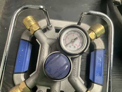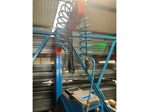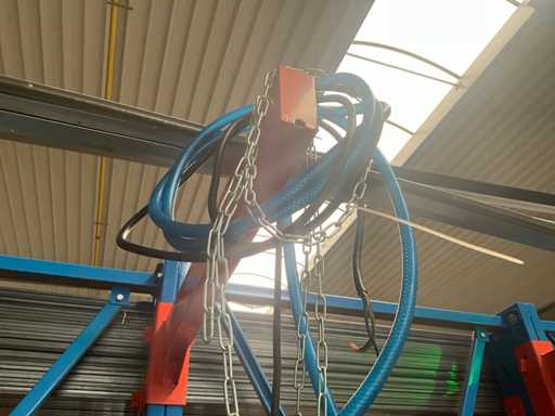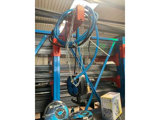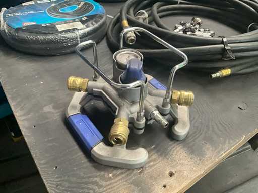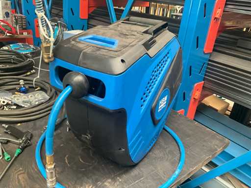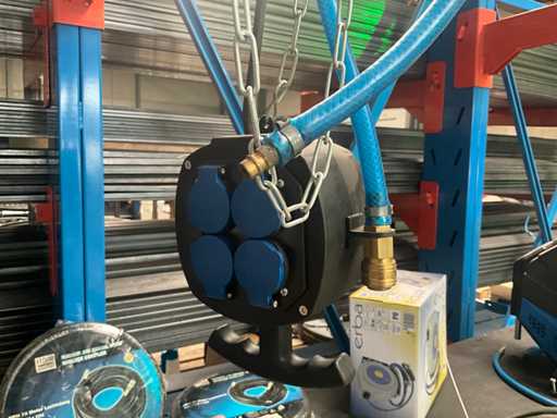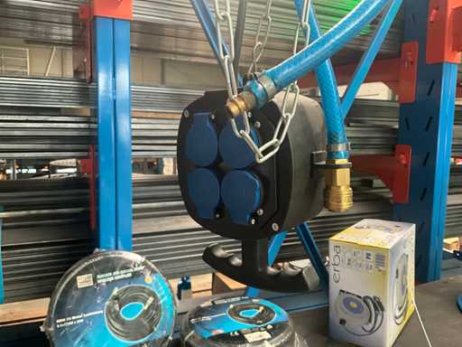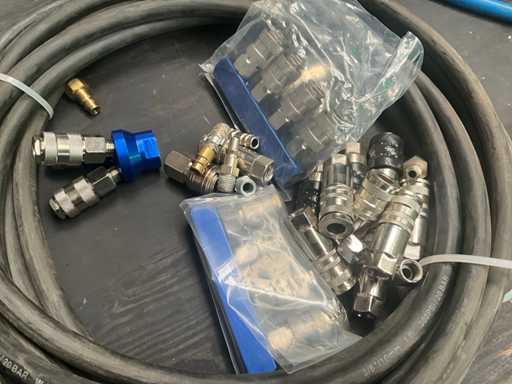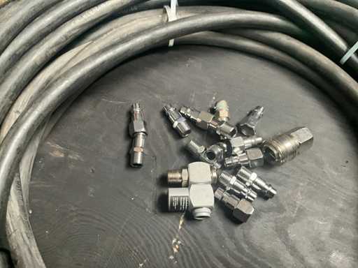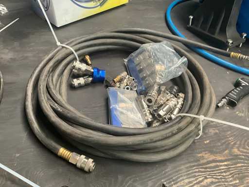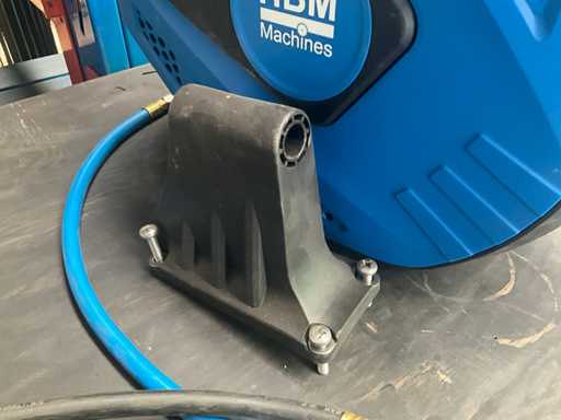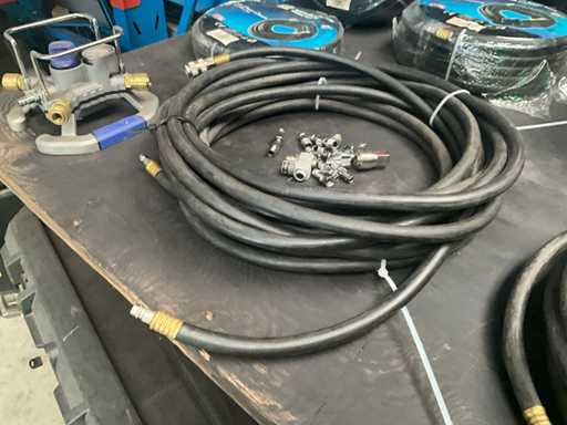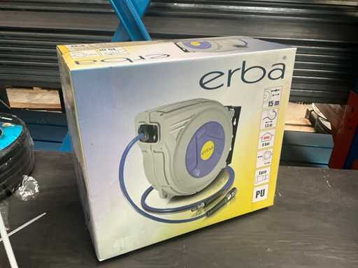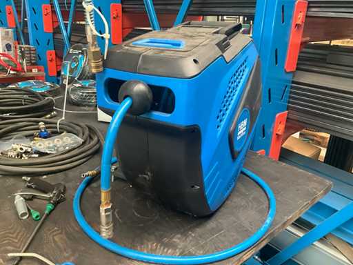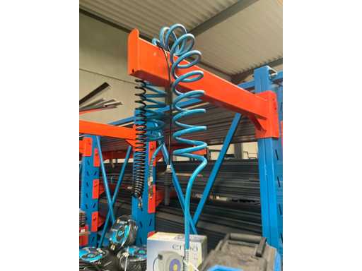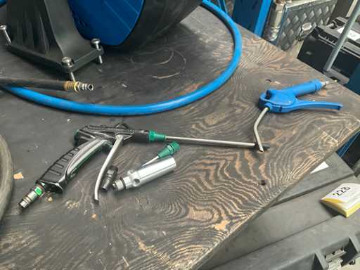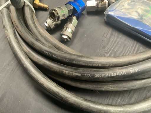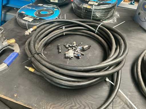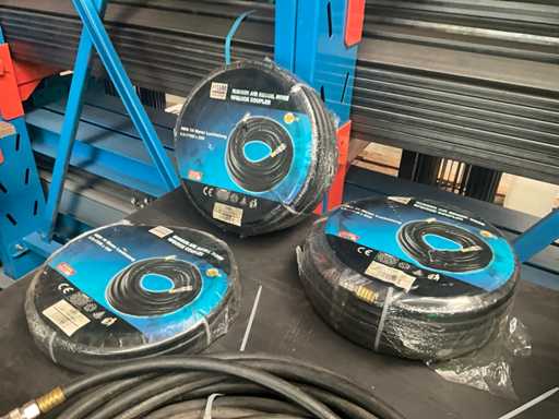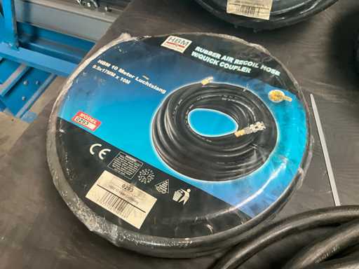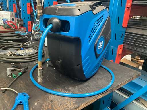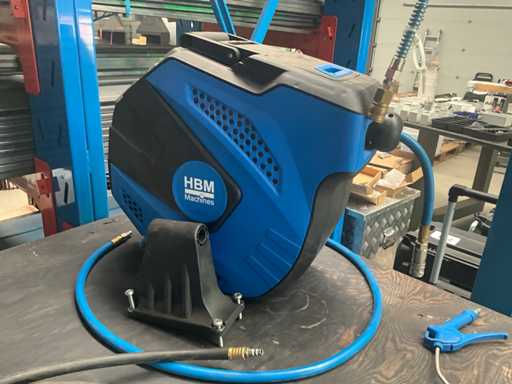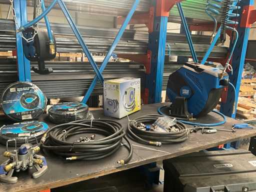 Zijnde HBM persluchtslang op haspel voorzien van terugskagklep en gedemonteerde roteerbare muurhouder, 3 diverse luchtslangen HBM 10 en 20 meter, 2 losse exemplaren met enig toebehoren en luchtslang ERBA 15 meter op haspel in doos, compleet met meettoestel, enige pistolen waaronder op flexibel en 1 voorzien van stopcontactdoos.