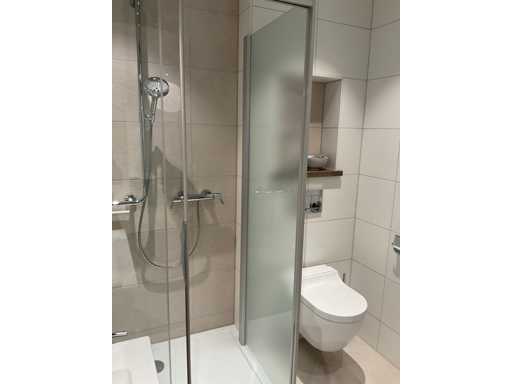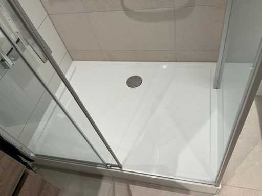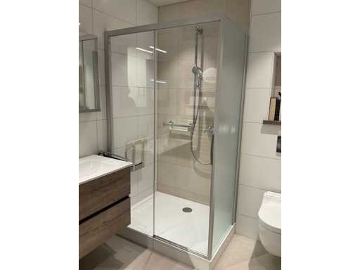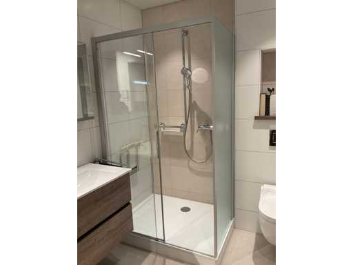 zijwand 74 cm breed; gesatineerd glas; schuifdeur; hoogte 195 cm; aluminium profielen; Villeroy&Boch douchevloer afm. 120x90x13 cm; zonder de douchemengkraan; LET OP: door koper zelf ter plaatse nog te demonteren; zonder de getoonde accessoires