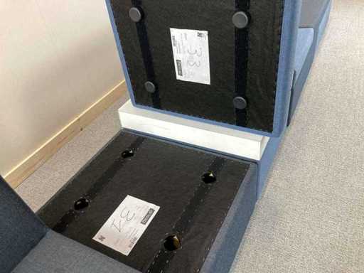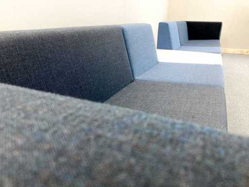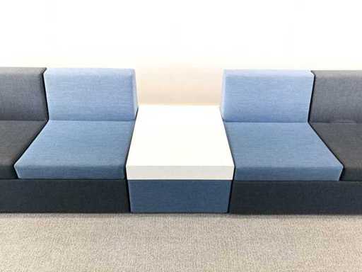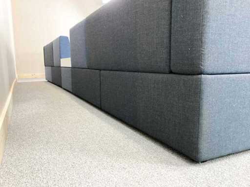 Drisag Bea Bench Remix 743. Modulaire soft-seating units van Drisag met donkergrijze en blauwe kleuren. Het zijn 2 units met 3 zit plekken, waarvan 2 met rugleuning. Ieder unit heeft 1 zijwand, 1 aan de linkerkant en 1 aan de rechterkant. De tafel zit los van de zitting, waardoor veel settings mogelijk zijn. U kunt bvb: de modulen in één grote lijn te laten, een hoek te vormen, de zitting over elkaar met de tefel tussen of ze rug tegen rug zetten.