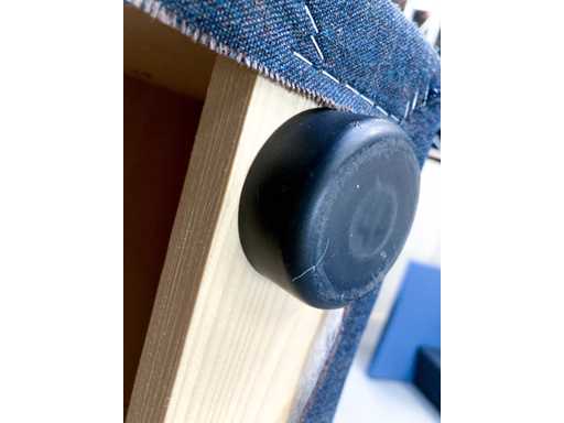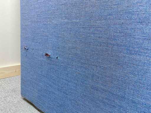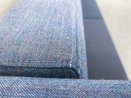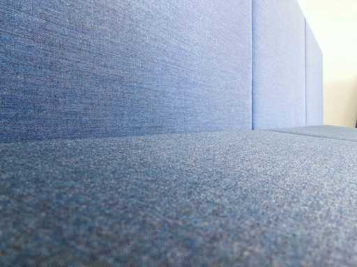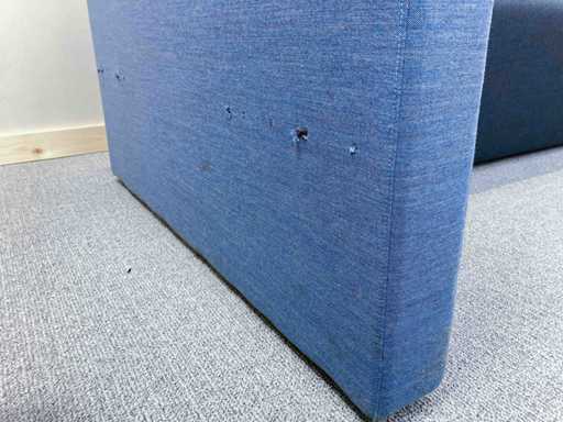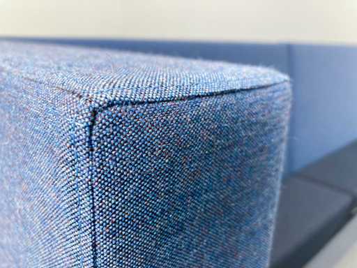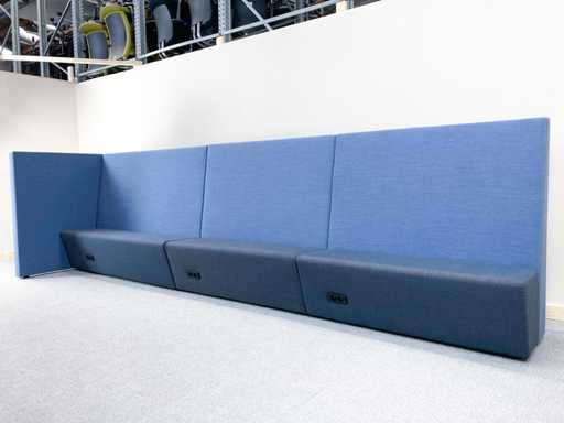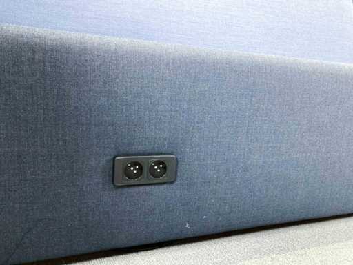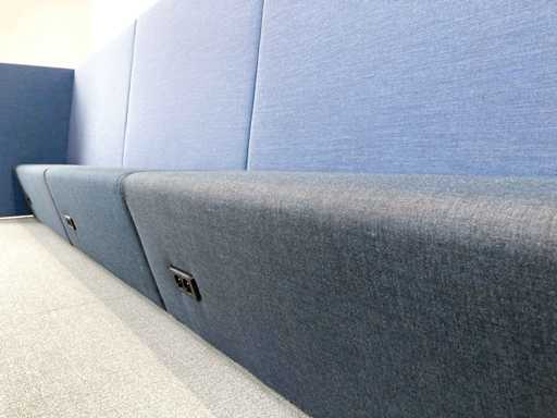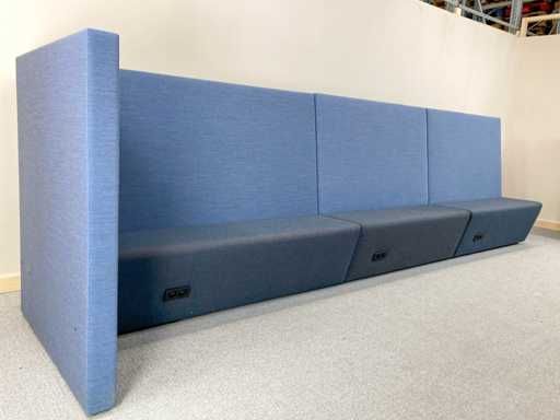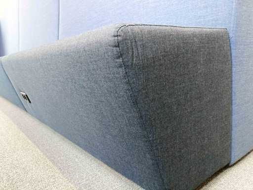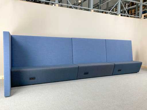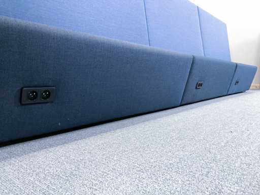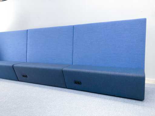 Lange softseating zitbank van merk Drisag, met blauwe achterwanden en één zijwand aan de linkerkant. De 3 zitting units (1 lange en 2 korte) zijn donkergrijs en ieder voorzien van een dubbele stopcontact (de stekker ligt dan onder de zitplek). Er zijn tot 10 zitplekken.