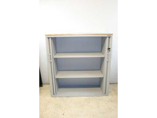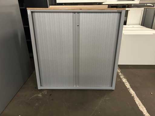 Volledig houten kader kleur Alu, rolluiken in kunststof kleur Alu, 2 legplanken kleur Alu, afmetingen 1300 x 1200 x 480 mm (h x b x ), top in houtfineer kleur Eik, zeer zware kwaliteit en in zeer goede staat, sleutels kunnen ontbreken !