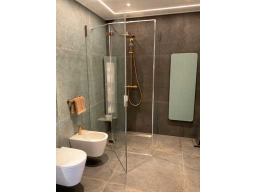 zijwand en douchedeur; profielen chroom mat; zonder de douchekraan en sunshower; LET OP: door koper zelf ter plaatse nog te demonteren; zonder de getoonde accessoires