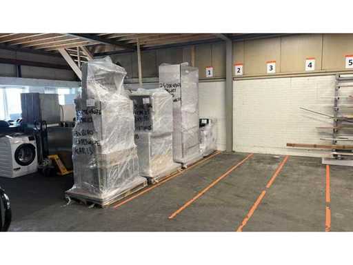 Conditie: gebruikt; afmetingen linkerdeel circa 414x69x236 cm; afmetingen rechterdeel circa 261x60x90 cm; reeds gedemonteerd en ingepakt op pallets (afstapelen, omruilen of statiegeld per pallet); pallets zijn niet inbegrepen; statiegeld betalen bij afhalen, of pallets afstapelen; werkblad niet ingepakt op pallets (25-2DE-03076)