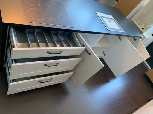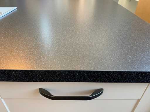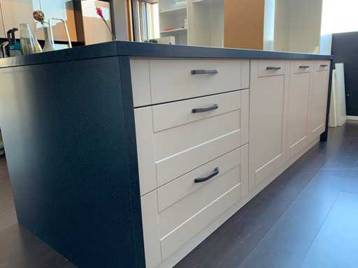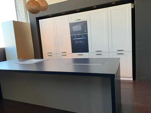 Toonzaalkeuken expo 41 IN BOUWPAKKET: Bestaande uit kook-/werkeiland, ingemaakte kast. Voorzien van: - Formica werkblad, dikte 38 mm, - Deuren en laden in MDF met afgerond laminaat 19mm, - Soft close sluitingen, Totale afmetingen: - Eiland: 1000 x 2648 mm, - Inbouwkast: 3000 x H 2066 mm, Zonder keukentoestellen, decoratie, verlichting, barstoelen en kookgerei. Inclusief: plinten, plinthouders, verstelbare pootjes, softclose SAMET scharnieren, deurtjes 19mm, kasten 16mm, werkblad 38mm, roestvrijstaal handvaten. Elke kast is apart dus de opstelling kan gemakkelijk aangepast worden, werkblad is niet uitgezaagd dus de koper kan zelf bepalen waar de kookplaat en spoelbak wordt geplatst.