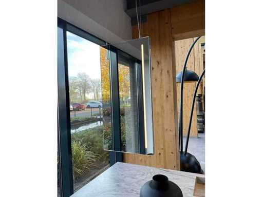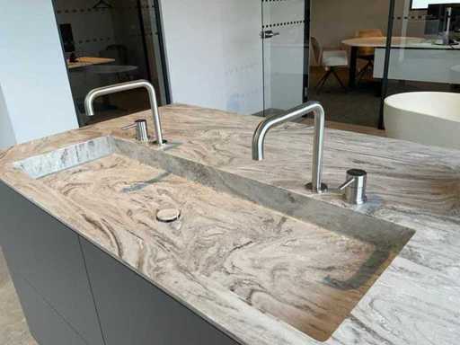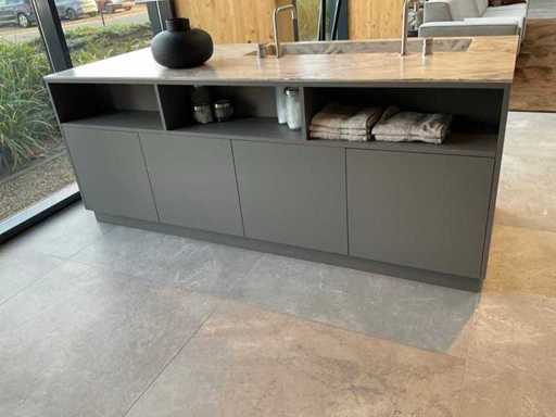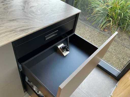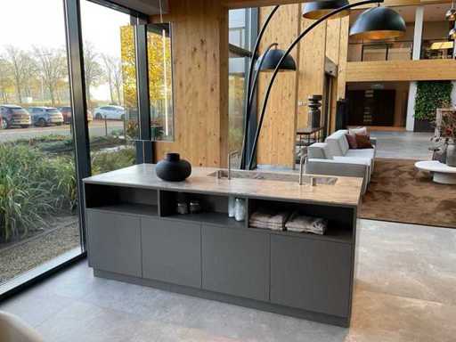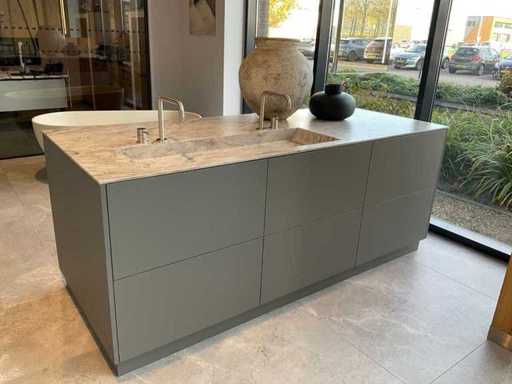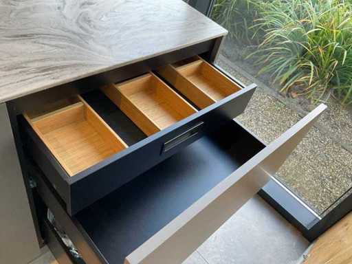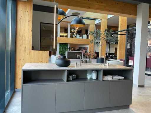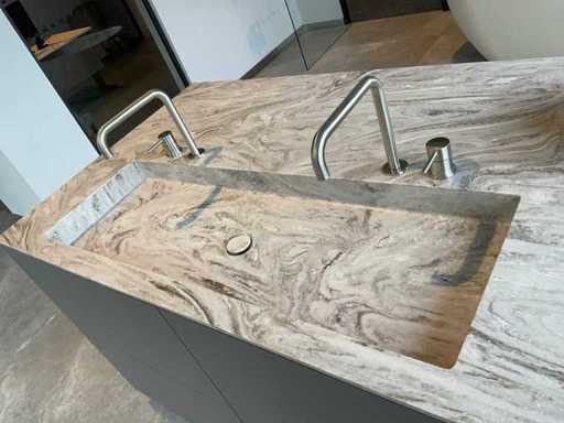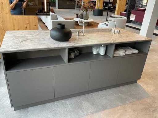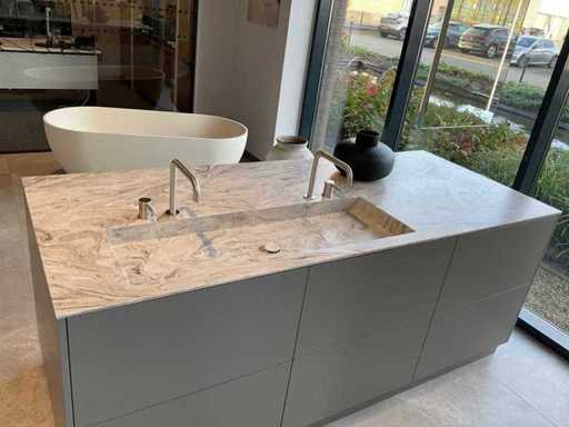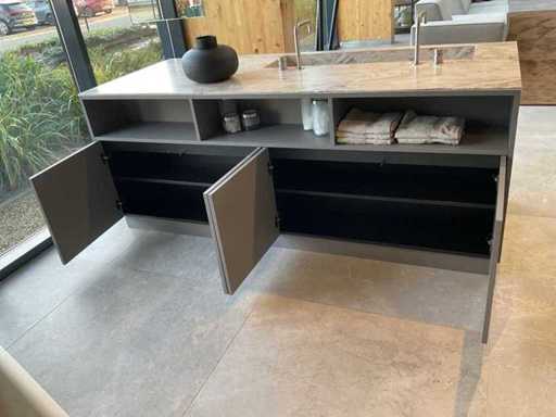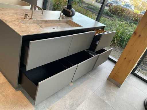 vrijstaand meubel met 6 laden; 1 binnenlade en stopcontact; 2 onderkasten en 3 open regaalvakken; push-to-open; Corian werkblad kleur smoke drift; 2 Jee-O wastafelmengkranen rvs; Mene vrijhangende spiegelen verlichting; afm. 50x100 mm; Reeds gedemonteerd .