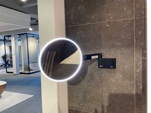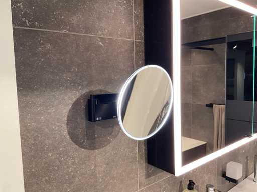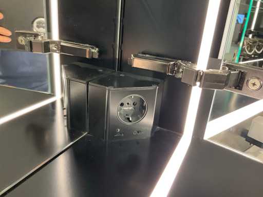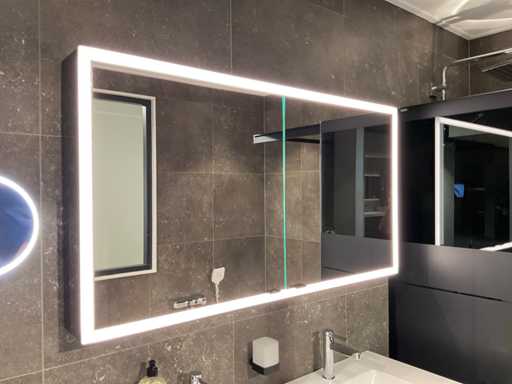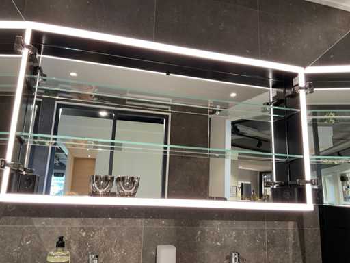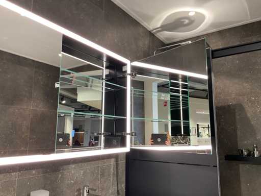 2 dubbelzijdige spiegeldeuren met 2 glazen legplanken; achterwand spiegel; 2 wandcontactdozen; scheerspiegel diameter 21 cm; LET OP: door koper zelf ter plaatse nog te demonteren; zonder de getoonde accessoires