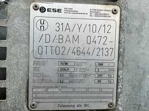 Gegalvaniseerd staal; wanddikte 2 mm; hijsogen; heftruck vorksleuven; vulgraad meter; slangen; openklapbaar deksel; 1x afsluitdop; mangat; stapelbaar