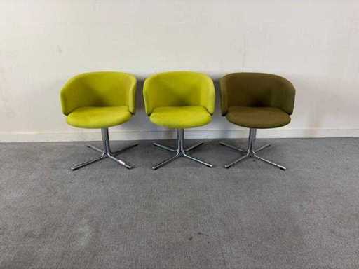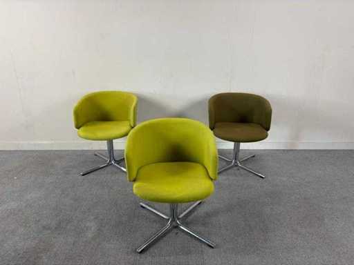 Set van 3 stoffen groene clubstoelen met zachte zitting. Chrome onderstel