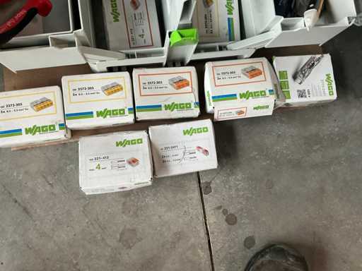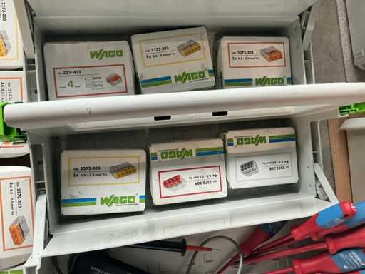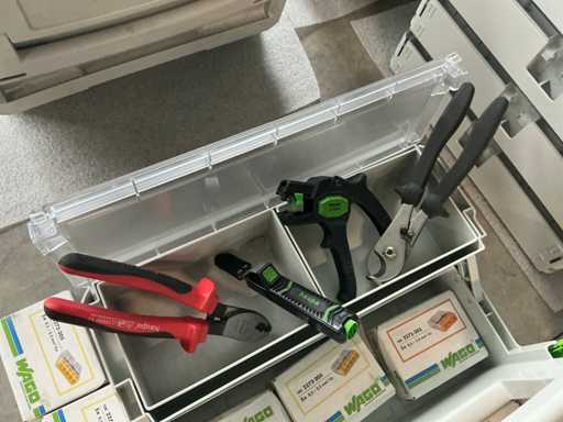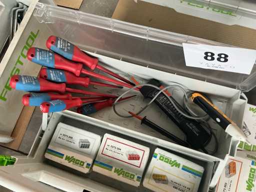 Inhoud bestaande uit circa 13 doosjes diverse Wago’s. Schroevendraaiers Gedore. Spanningstester Steinel. Tangen Haupa