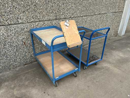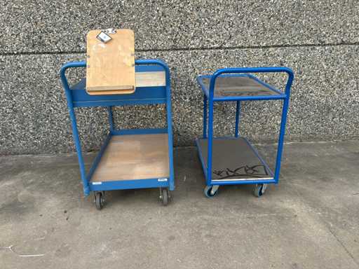 Twee robuuste industriële transportwagens van het merk Fetra, geschikt voor intern transport in magazijn, productie of logistieke omgeving. Set bestaat uit één grotere etagewagen met twee niveaus en één compactere plateauwagen. Beide wagens zijn uitgevoerd in gelakt staal met houten laadplatformen.