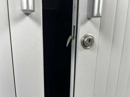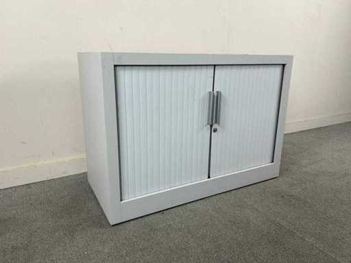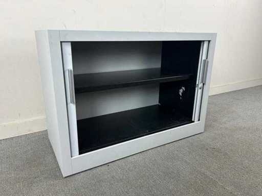 Compacte lage verticale rolduerkast in het grijs met enkele legger, sleutel niet gegarandeerd. 3 met ingedraaid slot, 4 met sleutel. Staat kan variëren per item en bij afhaal.