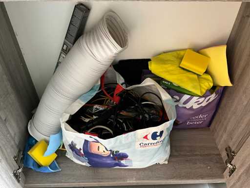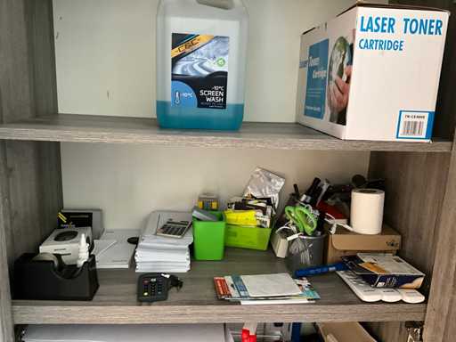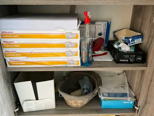 Inhoudende partij diverse kantoorbenodigdheden waaronder vijf pakken A3 papier enig schrijfgerei, enveloppen en enige elektro kabel