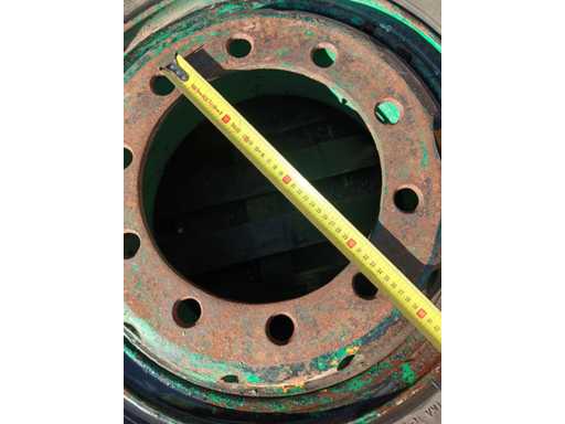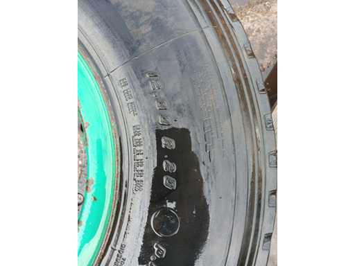 Stevige Firestone HP-3000 band met staalgordel, maat 12.00 R 20, gemonteerd op een 10-bouts stalen velg - Deze radiale tubetype band is geschikt voor zwaar transport, terrein- of landbouwtoepassingen - Kenmerken: Bandenmaat: 12.00 R 20 - Type: Firestone HP-3000 Steelcord Radial - Uitvoering: Tubetype - Velg: staal, 10-bouts (steekcirkel ca. 41 cm) - Profiel: diep, geschikt voor terrein- en weggebruik - Robuuste, duurzame constructie voor zware belasting - Staat: In gebruikte, maar nette en functionele staat; profiel goed zichtbaar, velg met oppervlakkige roest.