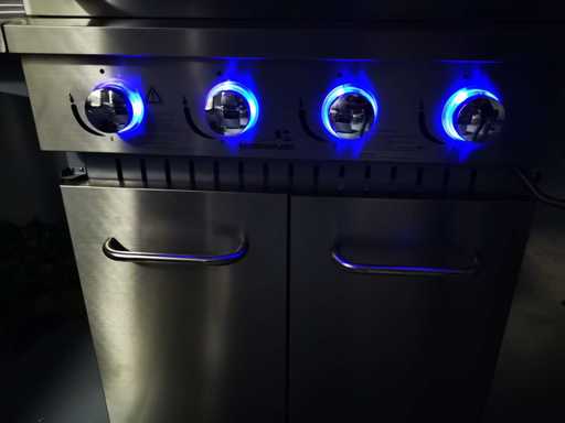 Type: JS-K004. RVS Gasbarbecue buitenkeuken met 4 hoofdbranders en 1 zijbrander. Voorzien van: Wasbak met kraan - Gietijzeren roosters met warmhoudrek en leklade - LED verlichting - Elektrische ontsteking - Deksel met thermometer - Verrijdbaar