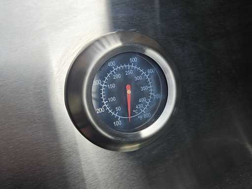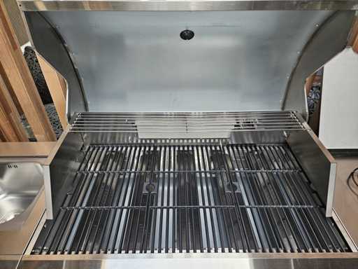 Type: JFK-005. Model: RVS Gasbarbecue – Complete buitenkeuken. Kleur: Zilverkleurig. Materiaal: RVS BBQ, Gietijzeren rooster. Afmetingen: B:308 x H118 x D:55 cm. 130 kg.. Grilloppervlak: 90x48 cm. Voorzien van: 6 Hoofdbranders en 1 extra gaspit – Draaispit – Koelkast – Wasbak met kraan – Verlichting - Gietijzeren rooster - Gietijzeren kookplaat – Warmhoudrek - Elektrische ontsteking - Deksel voorzien van thermometer - Wieltjes - Opbergruimte in 4 kastjes.