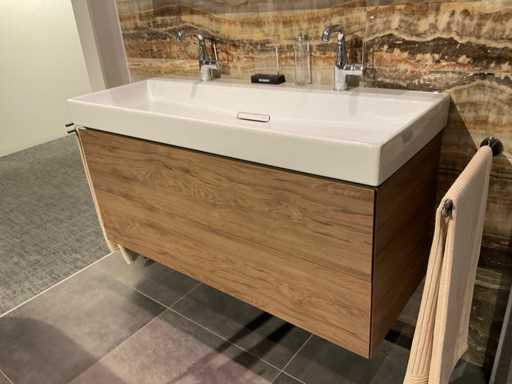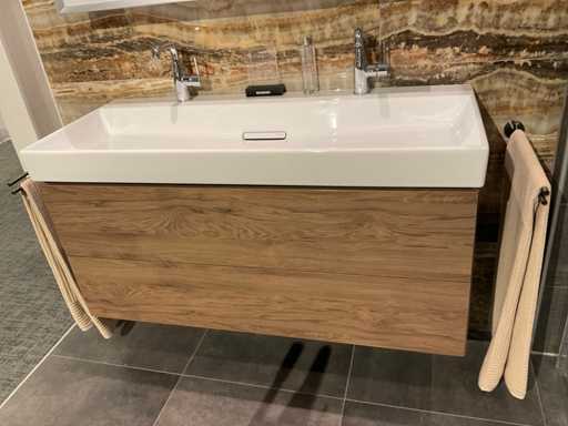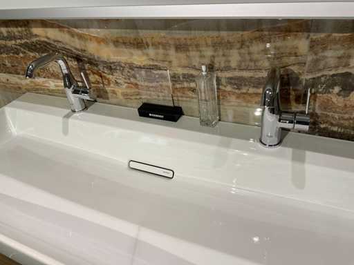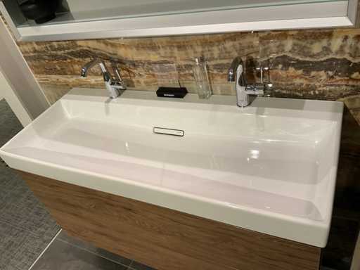 badmeubel met 2 laden; push-to-open; wastafelblad en 2 Grohe eengreeps wastafelmengkranen; LET OP: door koper zelf ter plaatse nog te demonteren; zonder de getoonde accessoires