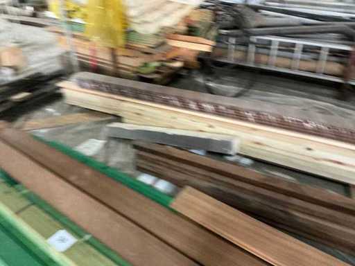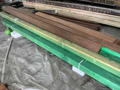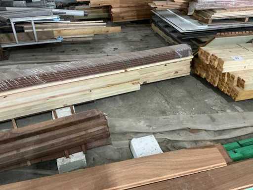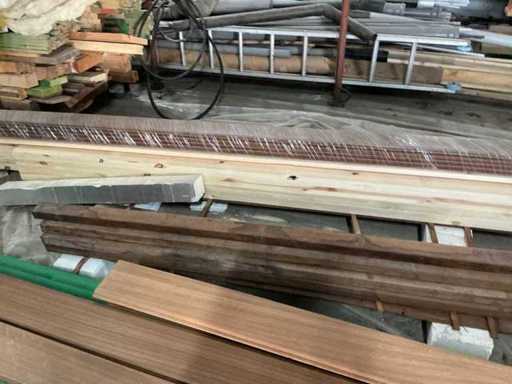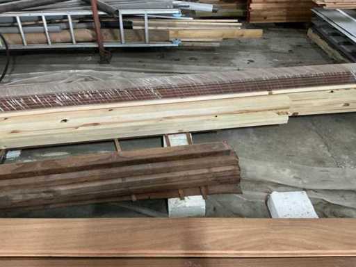 Compleet met diverse houten planken waaronder met lengtes: 190cm, 420cm en 450cm.