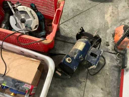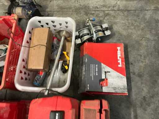 6 diverse lege gereedschapskoffers HILTI compleet met afzuig element HILTI te drs-4/6, luchtdarm op haspel GARDENA, enige defecte gereedschappen waaronder dubbelkopseslijpmolen, zaagmachine MAKITA, enzovoort