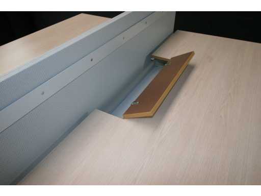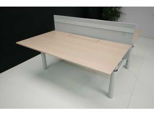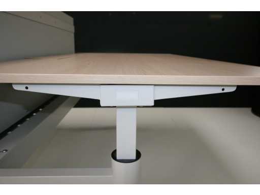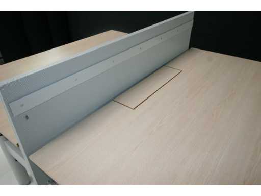 apart in hoogte verstelbaar (620 - 820 mm) onderstel kleur grijs voorzien van kabelgoot, werkbladen in melamine kleur lichte Eik voorzien van directe kabelgoot toegang, afm. bladen 1620 x 900 mm, afm. totaal: 1620 x 1900 mm, inclusief scheidingswand kleur licht grijs, in goede staat
