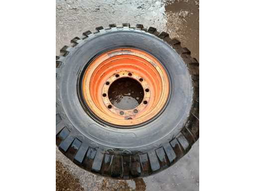 Stevige Goodyear 14.00-20 terreinband, gemonteerd op een 10-bouts stalen velg - Zware uitvoering met 14-laags (14 PR) karkas, geschikt voor offroad, landbouw- of industriële toepassingen - Kenmerken: Bandenmaat: 14.00–20 - Ply rating: 14 PR - Velg: staal, 10-bouts (steekcirkel ca. 32 cm) - Robuust profiel, diep en gelijkmatig - Geschikt voor zware voertuigen, trailers of terreinmachines - Band in goede staat, velg met oppervlakkige roest - Staat: Gebruikte, maar nette band met degelijk profiel.
