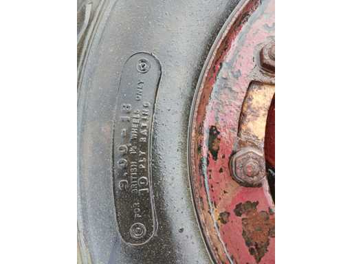Stevige Goodyear 9.00-16 band, gemonteerd op 6-bouts stalen velg - Degelijke diagonale uitvoering met 10-laags karkas, geschikt voor terreinwagens, landbouw- of militaire voertuigen - Kenmerken: Bandenmaat: 9.00-16 - Ply rating: 10 PR - Velg: staal, 6-bouts - Geschikt voor lichte vracht- of terreinvoertuigen - Robuuste diagonale constructie - Goed profiel, velg met gebruikssporen - Staat: Gebruikt, maar in nette en functionele staat.