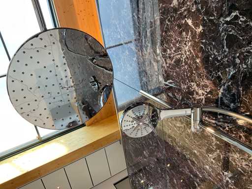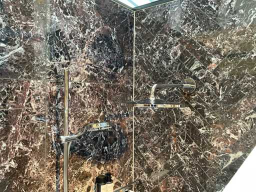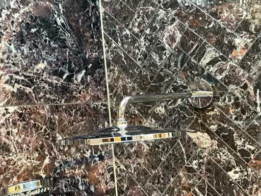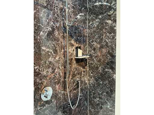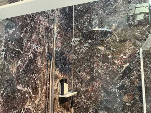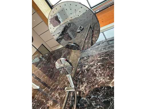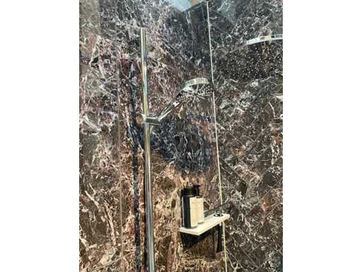 Regendouchekop; diameter 31 cm; glijstangset met handdouche en flexibele slang; muurkraan is een dummy; LET OP: door koper zelf ter plaatse nog te demonteren; zonder de getoonde accessoires